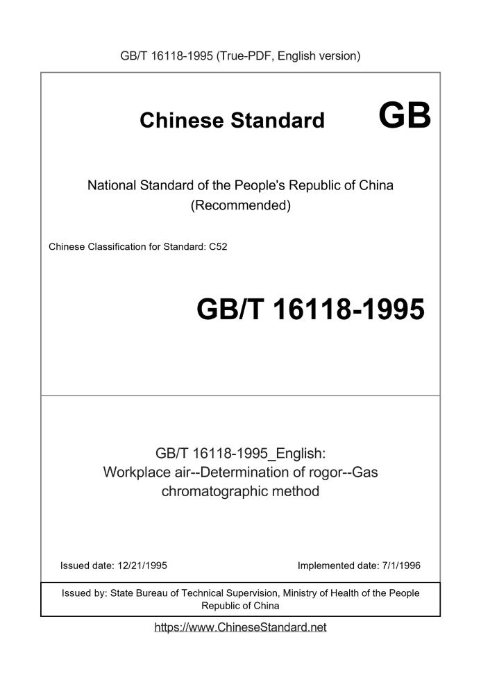 Delivery: <= 2 days. True-PDF full-copy in English will be manually translated and delivered via email. GB/T 16118-1995: Workplace air--Determination of rogor--Gas chromatographic method Status: Obsolete