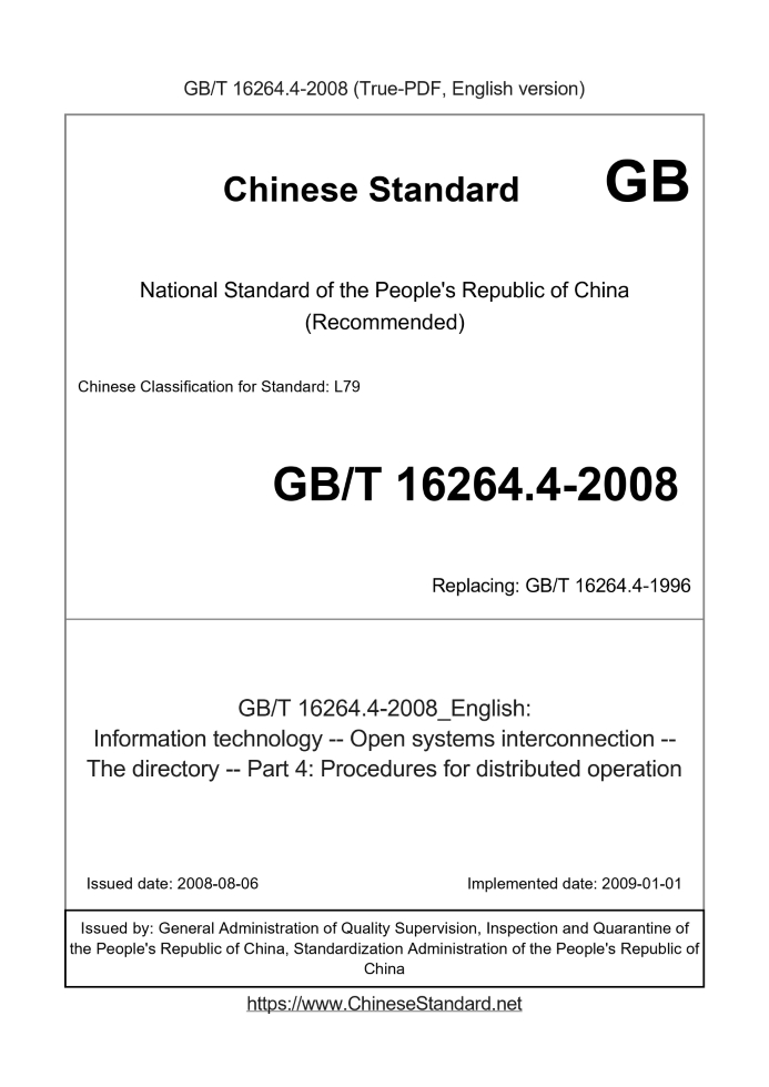 Basic dataStandard ID: GB/T 16264.4-2008 (GB/T16264.4-2008)Description (Translated English): Information technology -- Open systems interconnection -- The directory -- Part 4: Procedures for distributed operation Sector / Industry: National Standard (Recommended) Classification of Chinese Standard: L79 Classification of International Standard: 35.100.70 Word Count Estimation: 120,147 Date of Issue: 2008-08-06 Date of Implementation: 2009-01-01 Older Standard (superseded by this standard): GB/T 16264.4-1996 Adopted Standard: ISOIEC 9594-1-2005, IDT Regulation (derived from): Announcement of Newly Approved National Standards No. 12 of 2008 (No. 125 overall) Issuing agency(ies): General Administration of Quality Supervision, Inspection and Quarantine of the People's Republic of China, Standardization Administration of the People's Republic of China Summary: This standard specifies a distributed directory applications involving DSA behavior. For wide area across many DSA DIB, has been designed to allow the conduct to ensure consistent service. Although the directory can be established on top of a common database systems, but it does not belong to such a general database system. Directory query operations on the assumption that an update operation frequently than established in the case. GB/T 16264.4-2008: Information technology -- Open systems interconnection -- The directory -- Part 4: Procedures for distributed operation---This is a DRAFT version for illustration, not a final translation. Full copy of true-PDF in English version (including equations, symbols, images, flow-chart, tables, and figures etc.) will be manually/carefully translated upon your order. . Information technology Open systems interconnection The directory Part 4. Procedures for distributed operation ICS 35.100.70 L79 National Standards of People's Republic of China GB/T 16264.4-2008/ISO /IEC 9594-4.2005 Replacing GB/T 16264.4-1996 Information technology - OSI Directory Part 4. Procedures for distributed operation (ISO /IEC 9594-1.2005Informationtechnology-OpenSystems Interconnection-TheDirectory. Proceduresfordistributedoperation, IDT) Posted 2008-08-06 2009-01-01 implementation Administration of Quality Supervision, Inspection and Quarantine of People's Republic of China Standardization Administration of China released Table of ContentsPreface Ⅰ Introduction Ⅱ First. 1 Review 1 Scope 1 2 Normative references 1 3 Terms and definitions 2 4 Abbreviations 6 5 Conventions 6 Second. Overview 6 6 Overview 6 Episode 3. 7 Model distributed directory 7 distributed directory system model 7 8 DSA interaction model 8 Part IV. DSA abstract service 11 9 DSA abstract service overview 11 10 Information Type 11 Binding Binding 20 11 Reconciliation Operation 21 12 Link 13 Link Error 22 Part V. Distributed Practice 23 14 Overview 23 15 distributed directory behavior 24 16 Operating scheduler 29 17 request validation procedure 35 18 (called) Analytical procedures 38 19 Operation Assignment (evaluation) 47 20 consecutive reference procedure 67 21 79 result of the merger procedure Distributed identification procedures 81 22 Section 6. Knowledge management 82 23 Knowledge Management Overview 82 Operation 24 graded bound 85 25 non-specific binding 93 hierarchical operations Appendix A (normative) distributed operation of ASN. 1 Definitions 97 Annex B (informative) distributed name Example 102 (called) resolution Annex C (informative) Identification of distributed use 104 Annex D (normative) hierarchical and non-hierarchical operations specific binding type specification 110 Annex E (informative) Example 113 maintenance knowledge GB/T 16264.4-2008/ISO /IEC 9594-4.2005ForewordGB/T 16264 in the "Information Technology OSI Directory" general title, comprising 10 sections. --- Part 1. Overview of concepts, models and services; --- Part 2. Model; --- Part 3. Abstract service definition; --- Part 4. Procedures for distributed operation; --- Part 5. Protocol specification; --- Part 6. Selected attribute types; --- Part 7. Selected object classes; --- Part 8. a public key and attribute certificate frameworks; --- Part 9. Copy (to be published); --- Part 10. System Management uses common directory management mechanism (to be released). This section is GB/T Part of 416,264. This section identical with the international standard ISO /IEC 9594-4.2005 "Information technology - OSI Directory Distributed Operating Regulations ", only editorial changes. This Part replaces GB/T 16264.4-1996. This portion of the GB/T 16264.4-1996 difference is. --- Increasing knowledge management; --- Expands the content of the clauses. This section of the Appendices A and D are normative appendix, Appendix B, Appendix C and Appendix E are informative appendices. This section proposed by the People's Republic of China Ministry of Information Industry. This part of the National Information Technology Standardization Technical Committee centralized. This section was drafted by. China Electronic Standardization Institute. The main drafters of this section. Xu Dongmei, Zhang Cui Feng Hui, Hu Shun, Liu governance. This section was first released in 1996, this is the first revision. GB/T 16264.4-2008/ISO /IEC 9594-4.2005IntroductionGB/T 16264 in this section, together with the other parts of this standard is to facilitate the interconnection of information processing systems to provide directory services customized. A set of such systems, together with the directory information which they hold, can be considered as a whole, known as the "directory." Directory Have information, collectively called the directory information base (DIB), is typically used to facilitate communication between subject and object, and the object of communication or related objects Communications, etc. These objects application entities, people, terminals and distribution lists as. Play in the OSI Directory in a key role, with the goal, in addition to their own interconnection standards minimum of technica