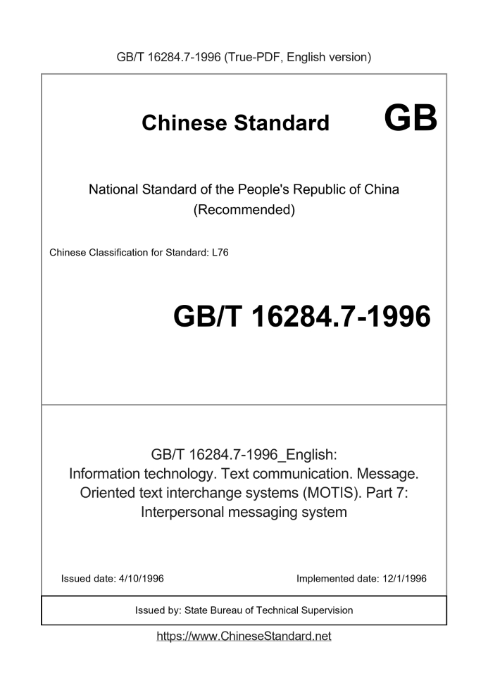 Delivery: <= 8 days. True-PDF full-copy in English will be manually translated and delivered via email. GB/T 16284.7-1996: Information technology. Text communication. Message. Oriented text interchange systems (MOTIS). Part 7: Interpersonal messaging system