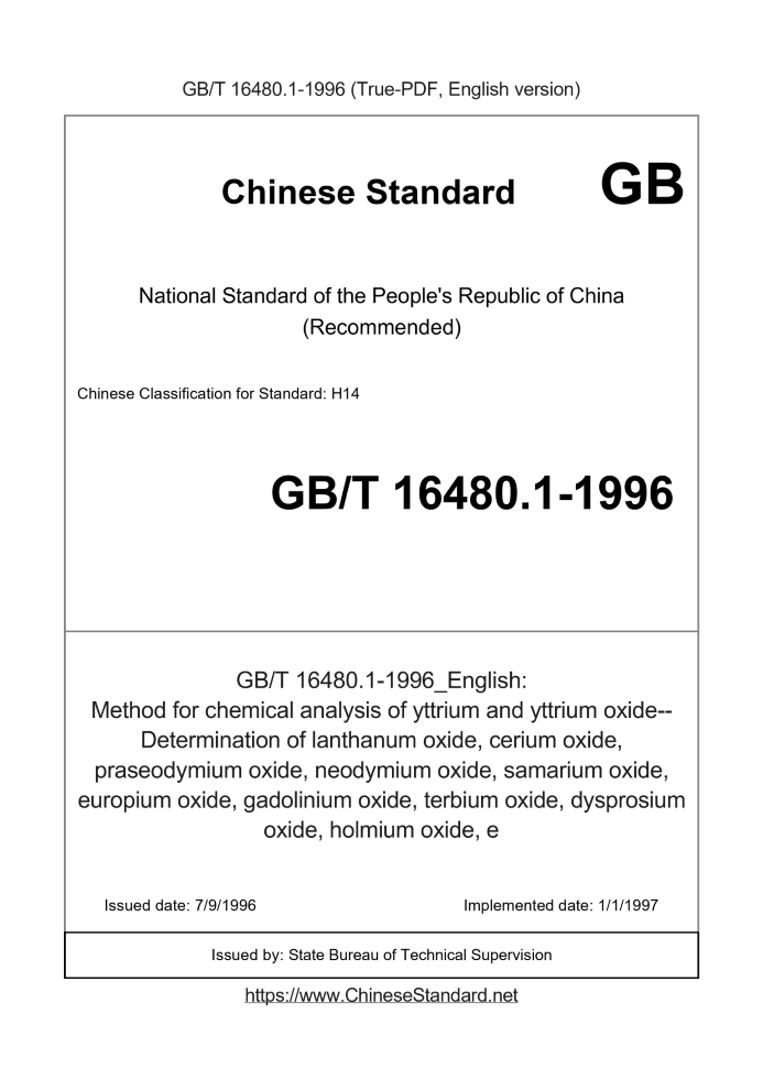 Delivery: <= 3 days. True-PDF full-copy in English will be manually translated and delivered via email. GB/T 16480.1-1996: Method for chemical analysis of yttrium and yttrium oxide--Determination of lanthanum oxide, cerium oxide, praseodymium oxide, neodymium oxide, samarium oxide, europium oxide, gadolinium oxide, terbium oxide, dysprosium oxide, holmium oxide, e Status: Obsolete