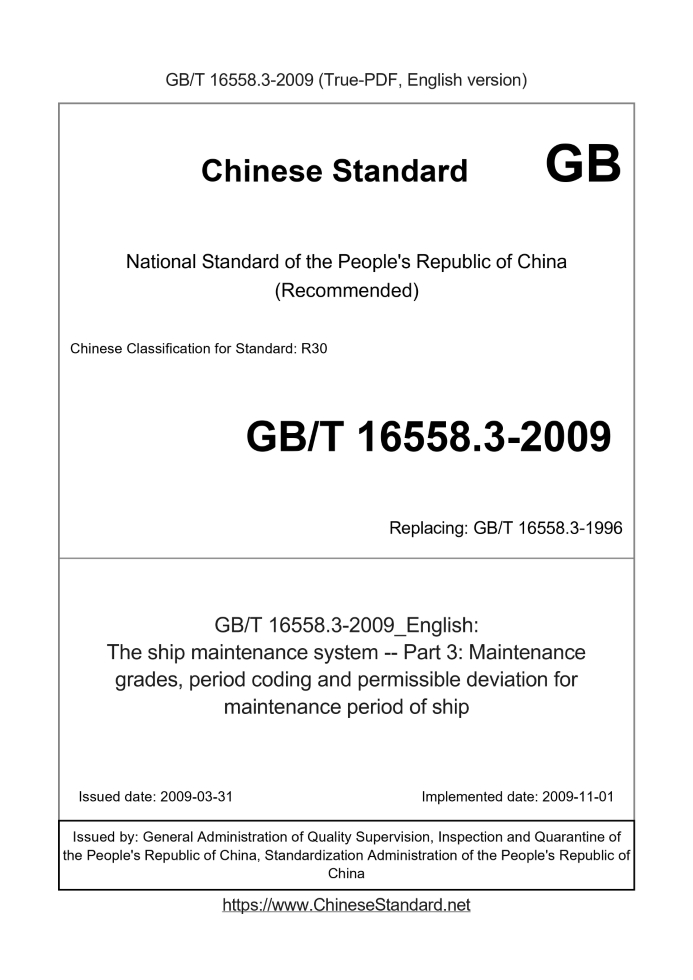 Basic dataStandard ID: GB/T 16558.3-2009 (GB/T16558.3-2009)Description (Translated English): The ship maintenance system -- Part 3: Maintenance grades, period coding and permissible deviation for maintenance period of ship Sector / Industry: National Standard (Recommended) Classification of Chinese Standard: R30 Classification of International Standard: 03.220.40; 47.020 Word Count Estimation: 5,527 Date of Issue: 2009-03-31 Date of Implementation: 2009-11-01 Older Standard (superseded by this standard): GB/T 16558.3-1996 Regulation (derived from): National Standard Approval Announcement 2009 No.4 (Total No.144) Issuing agency(ies): General Administration of Quality Supervision, Inspection and Quarantine of the People's Republic of China, Standardization Administration of the People's Republic of China Summary: This standard specifies the level of ship repair and maintenance work, period and the corresponding code, and the cycle tolerance limits. This section applies to ocean, coastal, manage river transport ship. Engineering vessels, management of ship and offshore facilities may refer to. GB/T 16558.3-2009: The ship maintenance system -- Part 3: Maintenance grades, period coding and permissible deviation for maintenance period of ship---This is a DRAFT version for illustration, not a final translation. Full copy of true-PDF in English version (including equations, symbols, images, flow-chart, tables, and figures etc.) will be manually/carefully translated upon your order. The ship maintenance system Part 3. Maintenance grades, period coding and permissible deviation for maintenance period of ship ICS 03.220.40; 47.020 R30 National Standards of People's Republic of China Replacing GB/T 16558.3-1996 The ship maintenance system - Part 3. Ship Repair Maintenance grades, cycles and cycle tolerance codes Posted 2009-03-31 2009-11-01 implementation Administration of Quality Supervision, Inspection and Quarantine of People's Republic of China Standardization Administration of China released ForewordGB/T 16558 "ship maintenance system" is divided into seven parts. --- Part 1. General; --- Part 2. The ship maintenance system codes; --- Part 3. Classification ship maintenance, periodic codes and cycle tolerance; --- Part 4. Equipment cards, work card format and initialization requirements; --- Part 5. work cards first row and operational requirements; --- Part 6. running system processes and management methods; --- Part 7. report format. This part of GB/T 16558 Part 3. This Part replaces GB/T 16558.3-1996 "ship maintenance ship maintenance system grading standards and codes week period Of tolerance. " This section compared with the GB/T 16558.3-1996, the main changes are as follows. --- Increasing the scope of ship and offshore installations (see Chapter 1); --- Maintenance of eight system were defined (see Chapter 2), for the first three to routine maintenance, after five to carry out planned maintenance The definition, according to the information management requirements of the original content has been simplified; --- According to the current regulatory requirements Chuanjian removed with four, six ship inspection cycle-related content. This part is proposed by the Ministry of Transport of the People's Republic of China. This part of the jurisdiction of the Ministry of Transport of the People's Republic of China Maritime Safety Administration. This section drafted by. China Ocean Shipping (Group) Corporation, Shanghai Maritime University, China Classification Society, Academy of Transportation Sciences. The main drafters of this section. Gulian Jun, Wang Guorong, Zhu hopes Wu Yuhua, Zheng Shijun. This part of the standard replaces the previous editions are. --- GB/T 16558.3-1996. The ship maintenance system - Part 3. Ship Repair Maintenance grades, cycles and cycle tolerance codes1 ScopeThis section GB/T 16558 specifies the level of the cycle and the corresponding code ship maintenance work, and the period of tolerance limit. This section applies to ocean, coastal, river transport ship management. Engineering vessels, ship management and marine facilities will be implemented by reference. Develop principles and level 2 ship maintenance period 2.1 maintenance level according to the actual needs of the ship as eight, the first three for the daily maintenance level after level five for the planned maintenance No, and plans to demand the establishment of the maintenance work cards. 2.2 Maintenance work five cards, the cycle should inspect standards and comply with the requirements of ship maintenance, a five-year cycle cycle. 2.3 Periodic maintenance operation of equipment according to different situations, respectively, using the cumulative counter equipment "operating hours" and two timing party calendar date law. The former is called timing cycle; the latter is called a regular cycle. 2.4 the same device in different maintenance levels according to the number of cycles the value of the relationship between high-level cycle principle of low-level cycle integer multiples OK.3 The ship maintenance cycles and classification codesShip repair and maintenance cycles, classification code, and the timing system regularly made provisions in Table 1. Table 1 Classification Codes regularly develop cycle when the system A five-year 1 day1 weekJanuary March June December 30 months 60 Months 1 day1 week500 operating hours 1500 operating hours 3000 operating hours 6000 operating hours 15,000 operating hours 30,000 operating hours4 Use the maintenance cycle codePress the same device can ship inspection and maintenance work required to set a variety of code within a loop system at regular intervals with the timing system works For the card. Example. If a repair equipment (parts) containing a D grade three-month period, the period of one year for the F-class, H period of five years three maintenance, its five-year A cycle ticket arrangements. DDDF, DDDF, DDDF, DDDF, DDDH.5 maintenance cycle tolerance level5.1 Per