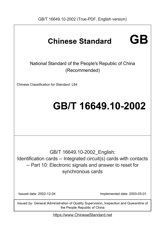 Delivery: <= 3 days. True-PDF full-copy in English will be manually translated and delivered via email. GB/T 16649.10-2002: Identification cards -- Integrated circuit(s) cards with contacts -- Part 10: Electronic signals and answer to reset for synchronous cards Status: Valid