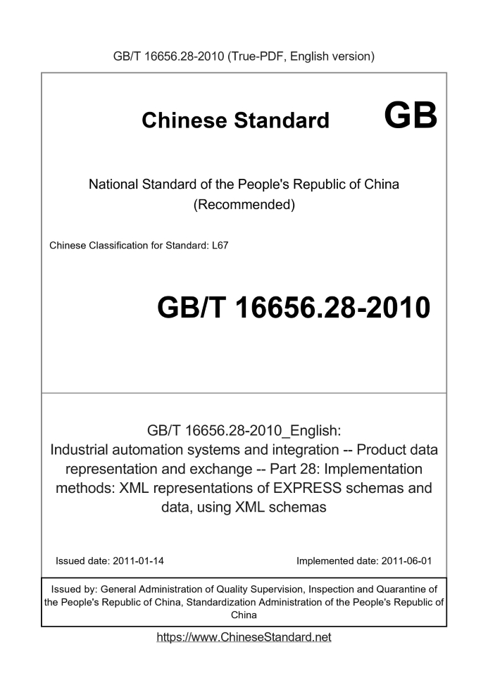 Delivery: <= 13 days. True-PDF full-copy in English will be manually translated and delivered via email. GB/T 16656.28-2010: Industrial automation systems and integration -- Product data representation and exchange -- Part 28: Implementation methods: XML representations of EXPRESS schemas and data, using XML schemas Status: Valid