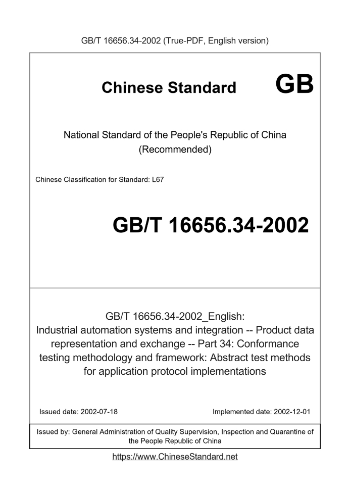 Delivery: <= 3 days. True-PDF full-copy in English will be manually translated and delivered via email. GB/T 16656.34-2002: Industrial automation systems and integration -- Product data representation and exchange -- Part 34: Conformance testing methodology and framework: Abstract test methods for application protocol implementations Status: Valid