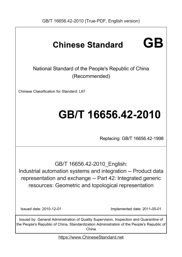 Delivery: <= 13 days. True-PDF full-copy in English will be manually translated and delivered via email. GB/T 16656.42-2010: Industrial automation systems and integration -- Product data representation and exchange -- Part 42: Integrated generic resources: Geometric and topological representation Status: Valid GB/T 16656.42: Historical versions