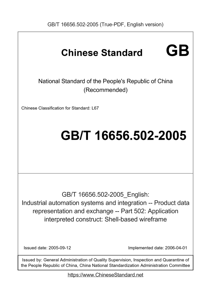 Delivery: <= 4 days. True-PDF full-copy in English will be manually translated and delivered via email. GB/T 16656.502-2005: Industrial automation systems and integration -- Product data representation and exchange -- Part 502: Application interpreted construct: Shell-based wireframe Status: Valid