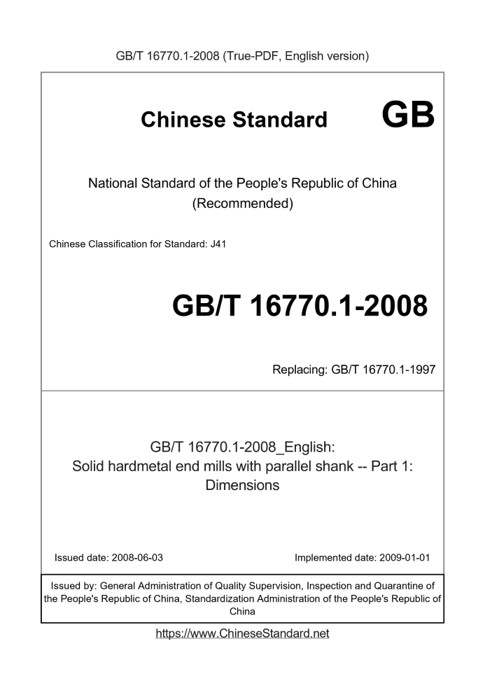 GB/T 16770 "Solid carbide straight shank end mill" is divided into two parts. --- Part 1. Dimensions; --- Part 2. Technical requirements. This section GB/T 16770 Part 1. The partial modification of the use of ISO 10911.1994 "Solid carbide straight shank end mill size." According to this part of ISO 10911.1994 redrafted. This part of ISO 10911.1994 have compared these technical differences. --- Amend the foreword; --- Modify the note and mark. This part is GB/T "Solid carbide straight shank end mills - Part 1. The types and dimensions" 16770.1-1997 amendments. Section compared with the GB/T 16770.1-1997 The main changes are as follows. --- Modify the normative references; --- Modify the note and mark. This part is proposed by China Machinery Industry Federation. This part of the tool by the National Standardization Technical Committee (SAC/TC91) centralized. This section is drafted. Shanghai Tool Works Co., Ltd. The main drafters of this section. Zhang, Li Zheng Wei. This part of the standard replaces the previous editions are. --- GB/T 16770.1-1997. Solid carbide straight shank end mill Part 1. Dimensions