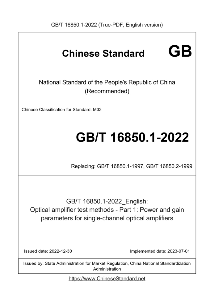 Delivery: <= 6 days. True-PDF full-copy in English will be manually translated and delivered via email. GB/T 16850.1-2022: Optical amplifier test methods - Part 1: Power and gain parameters for single-channel optical amplifiers Status: Valid GB/T 16850.1: Historical versions