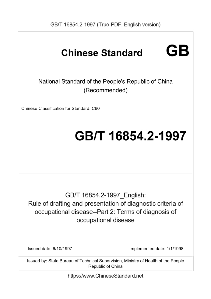 Delivery: <= 6 days. True-PDF full-copy in English will be manually translated and delivered via email. GB/T 16854.2-1997: Rule of drafting and presentation of diagnostic criteria of occupational disease--Part 2: Terms of diagnosis of occupational disease Status: Obsolete