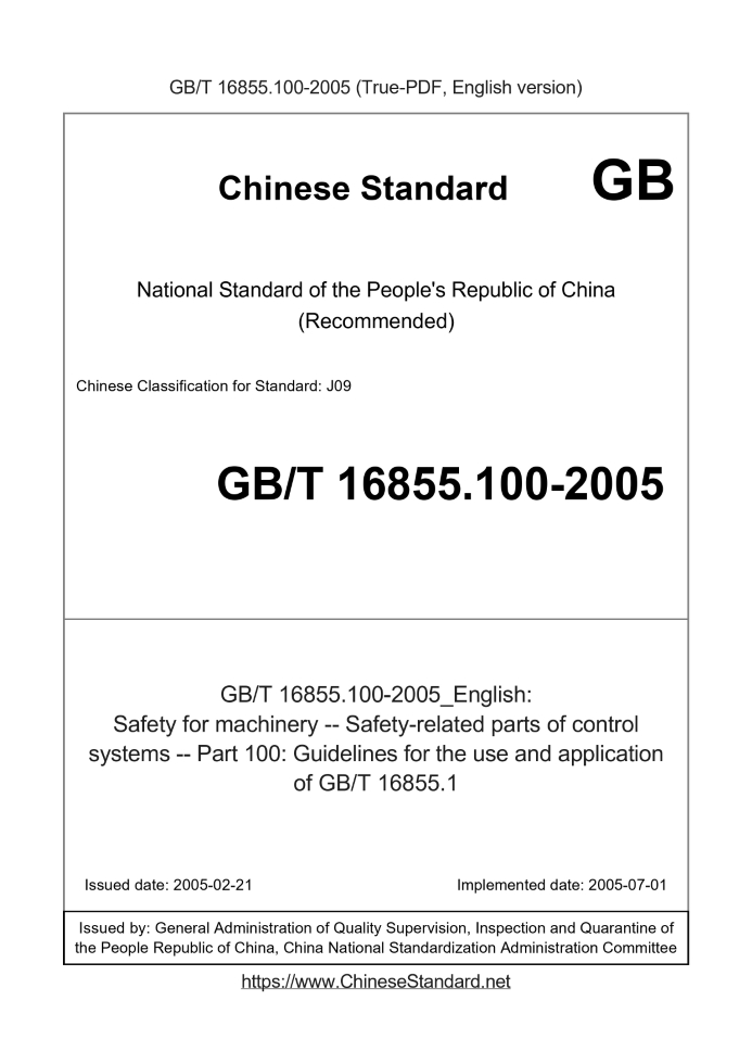 Delivery: <= 3 days. True-PDF full-copy in English will be manually translated and delivered via email. GB/T 16855.100-2005: Safety for machinery -- Safety-related parts of control systems -- Part 100: Guidelines for the use and application of GB/T 16855.1 Status: Obsolete