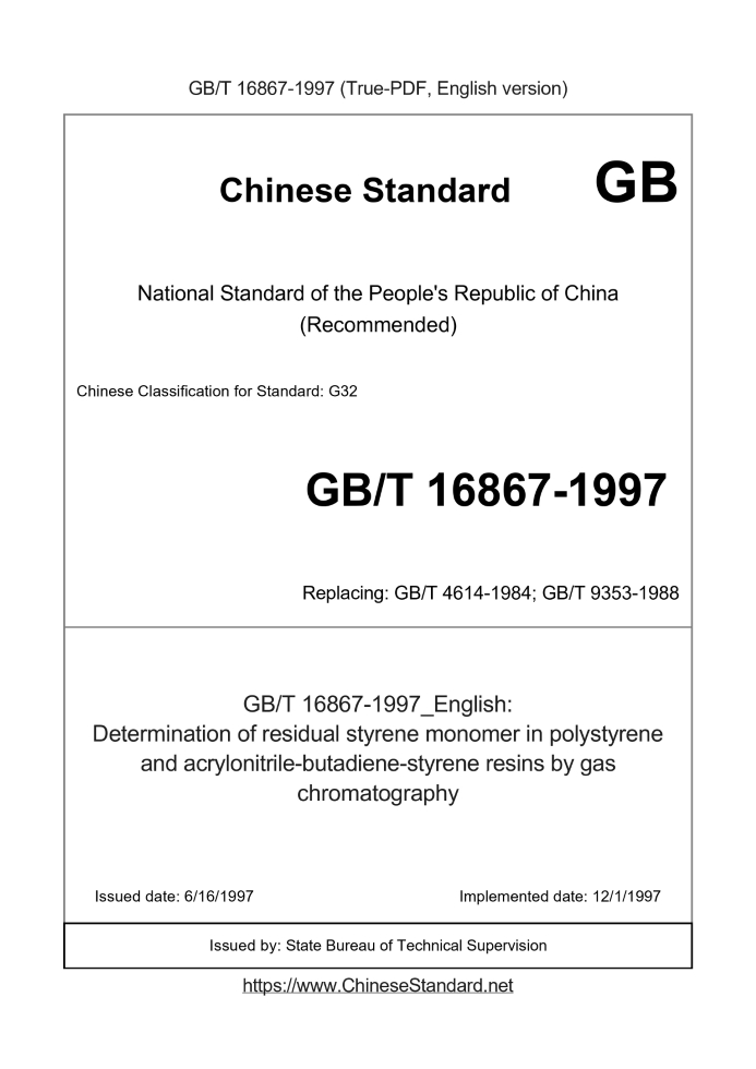 Delivery: <= 3 days. True-PDF full-copy in English will be manually translated and delivered via email. GB/T 16867-1997: Determination of residual styrene monomer in polystyrene and acrylonitrile-butadiene-styrene resins by gas chromatography