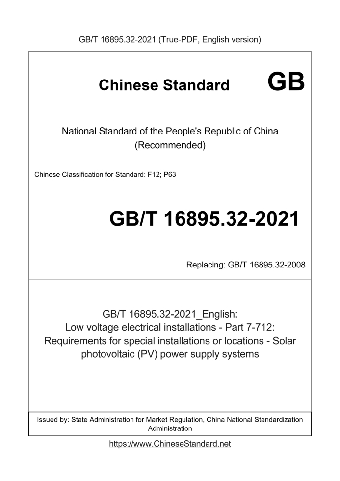 Delivery: <= 7 days. True-PDF full-copy in English will be manually translated and delivered via email. GB/T 16895.32-2021: Low voltage electrical installations - Part 7-712: Requirements for special installations or locations - Solar photovoltaic (PV) power supply systems Status: Valid GB/T 16895.32: Historical versions