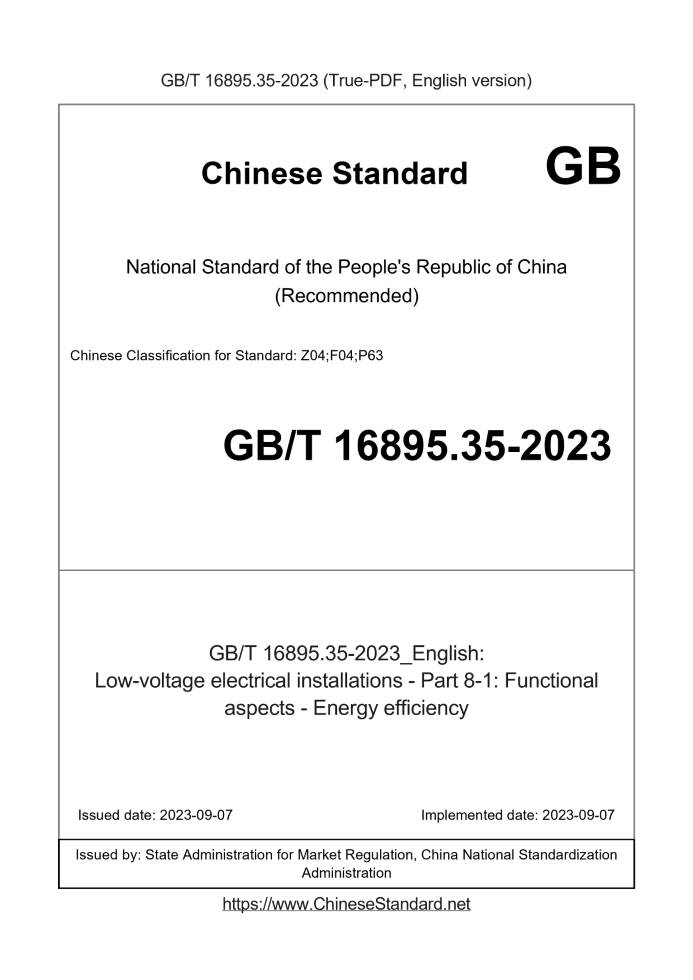 Delivery: <= 8 days. True-PDF full-copy in English will be manually translated and delivered via email. GB/T 16895.35-2023: Low-voltage electrical installations - Part 8-1: Functional aspects - Energy efficiency Status: Valid