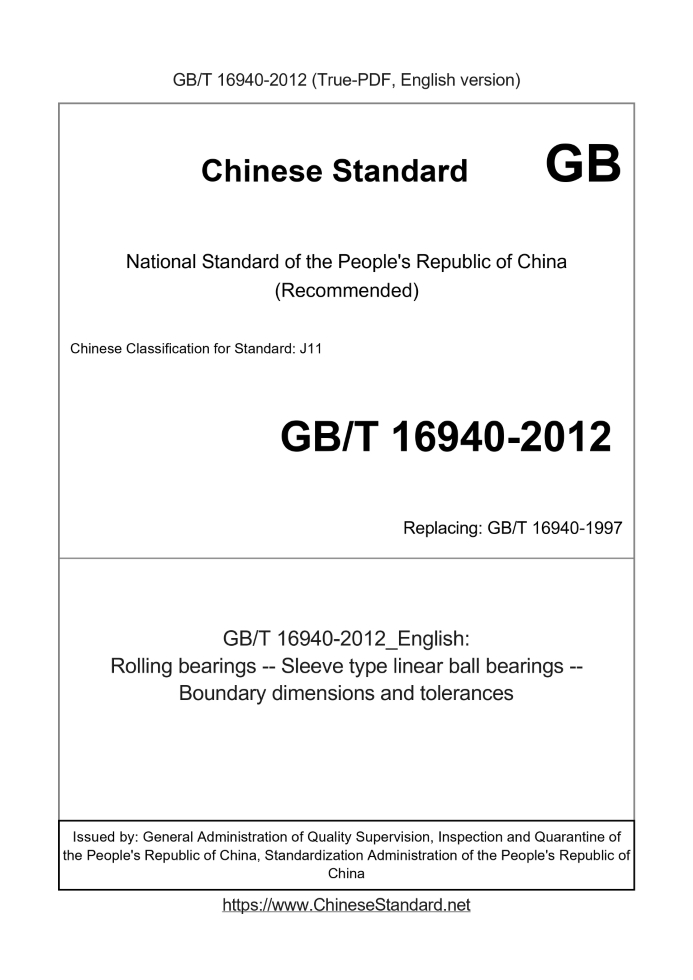Delivery: <= 3 days. True-PDF full-copy in English will be manually translated and delivered via email. GB/T 16940-2012: Rolling bearings -- Sleeve type linear ball bearings -- Boundary dimensions and tolerances Status: Valid GB/T 16940: Historical versions