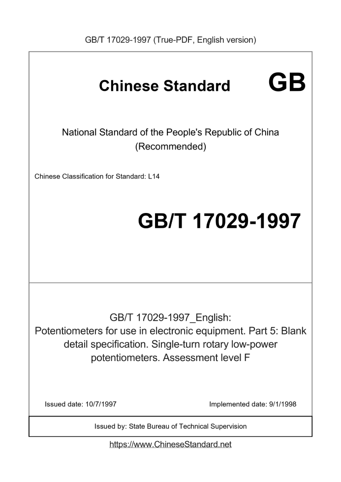Delivery: <= 3 days. True-PDF full-copy in English will be manually translated and delivered via email. GB/T 17029-1997: Potentiometers for use in electronic equipment. Part 5: Blank detail specification. Single-turn rotary low-power potentiometers. Assessment level F Status: Obsolete