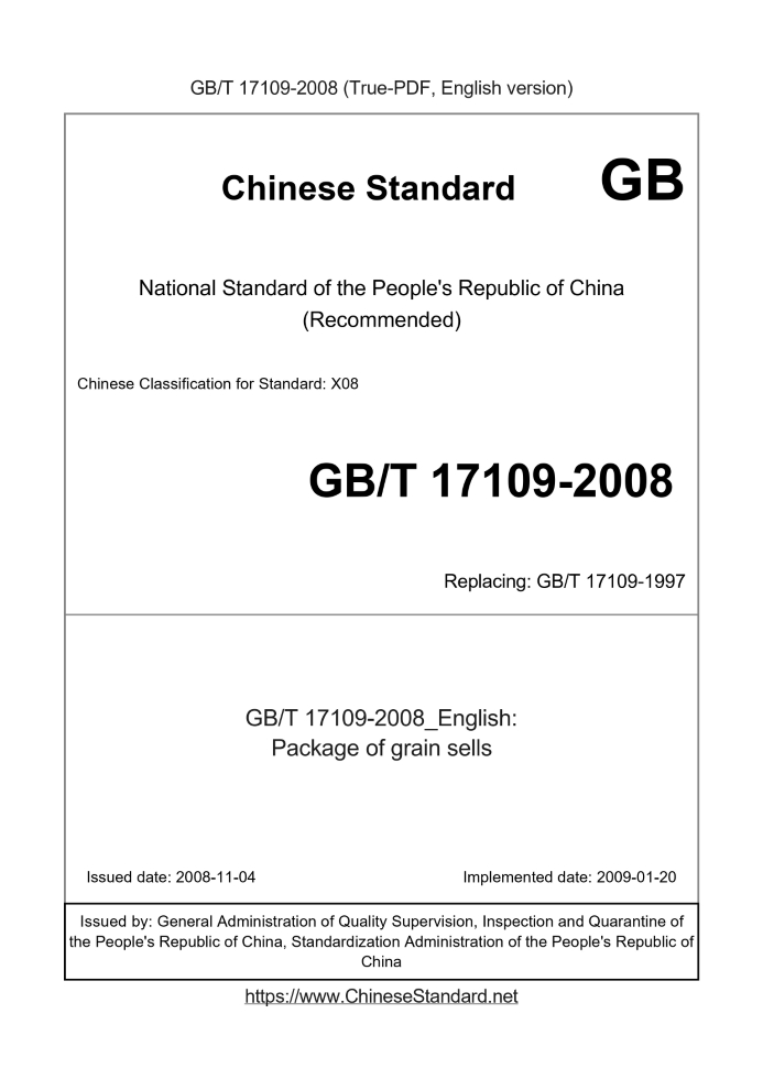 Delivery: <= 2 days. True-PDF full-copy in English will be manually translated and delivered via email. GB/T 17109-2008: Package of grain sells Status: Valid GB/T 17109: Historical versions