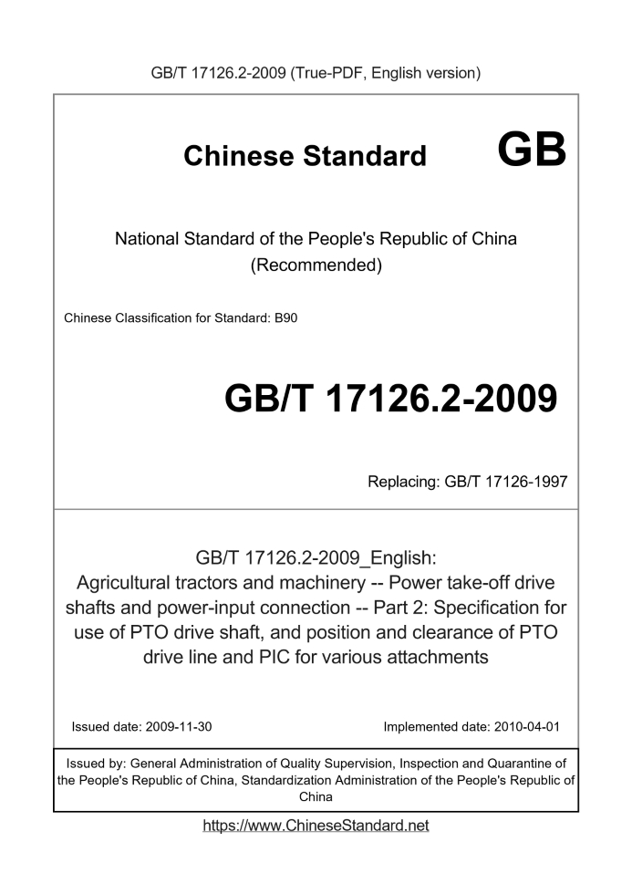Agricultural tractors and machinery Power take-off drive shafts and power-input connection Part 2. Specification for use of PTO drive shaft, and position and clearance of PTO drive line and PIC for various attachments ICS 65.060.01 B90 National Standards of People's Republic of China GB/T 17126.2-2009/ISO 5673-2.2005 Replacing GB/T 17126-1997 Agricultural tractors and machinery - Power Drive shafts and power - input connection Part 2. PTO shaft use Specifications, various types of coupling means drivetrain with a power output And the power input connection location and clearance range (ISO 5673-2.2005, IDT) Posted 2009-11-30 2010-04-01 implementation Administration of Quality Supervision, Inspection and Quarantine of People's Republic of China Standardization Administration of China released