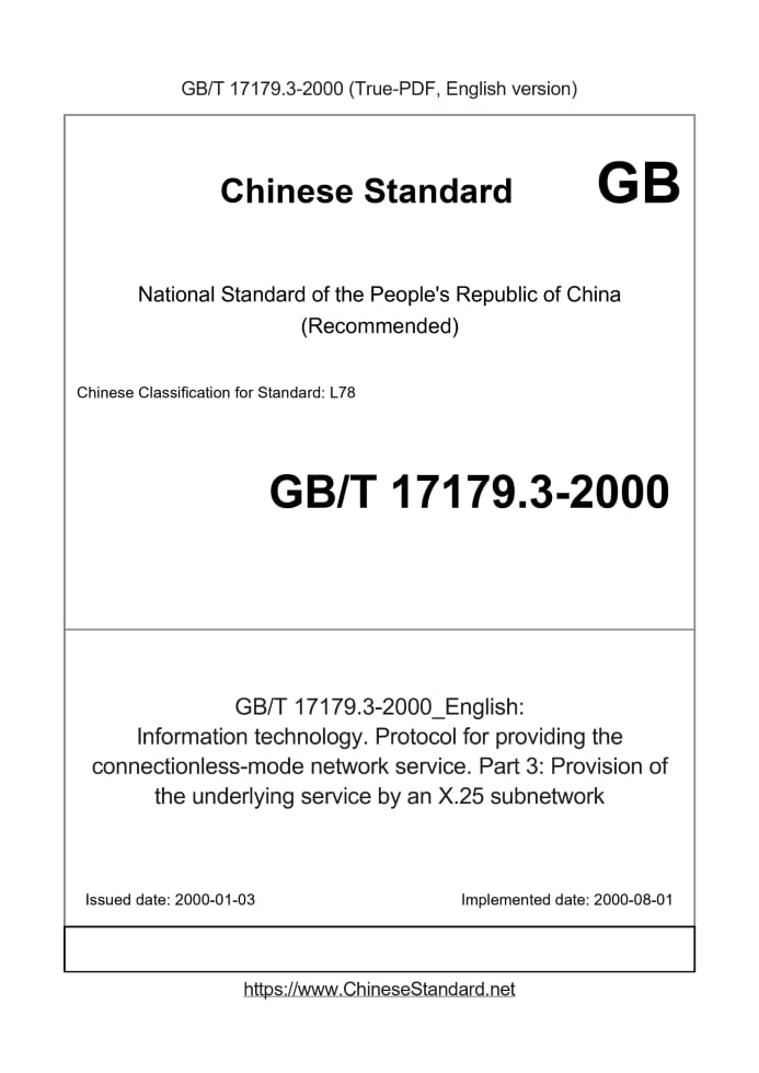 Delivery: <= 3 days. True-PDF full-copy in English will be manually translated and delivered via email. GB/T 17179.3-2000: Information technology. Protocol for providing the connectionless-mode network service. Part 3: Provision of the underlying service by an X.25 subnetwork