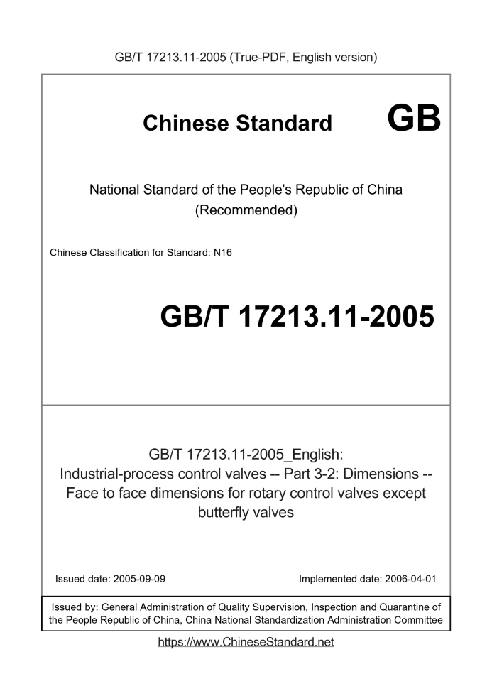 Delivery: <= 3 days. True-PDF full-copy in English will be manually translated and delivered via email. GB/T 17213.11-2005: Industrial-process control valves -- Part 3-2: Dimensions -- Face to face dimensions for rotary control valves except butterfly valves Status: Valid