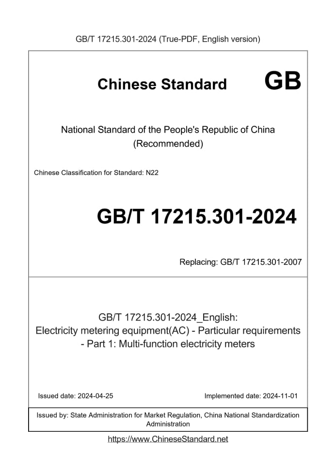 Delivery: <= 4 days. True-PDF full-copy in English will be manually translated and delivered via email. GB/T 17215.301-2024: Electricity metering equipment(AC) - Particular requirements - Part 1: Multi-function electricity meters Status: Valid GB/T 17215.301: Historical versions