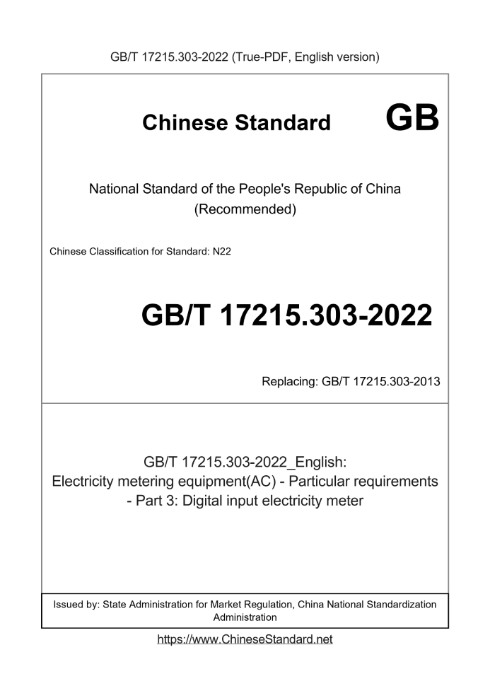 Delivery: <= 7 days. True-PDF full-copy in English will be manually translated and delivered via email. GB/T 17215.303-2022: Electricity metering equipment(AC) - Particular requirements - Part 3: Digital input electricity meter Status: Valid GB/T 17215.303: Historical versions