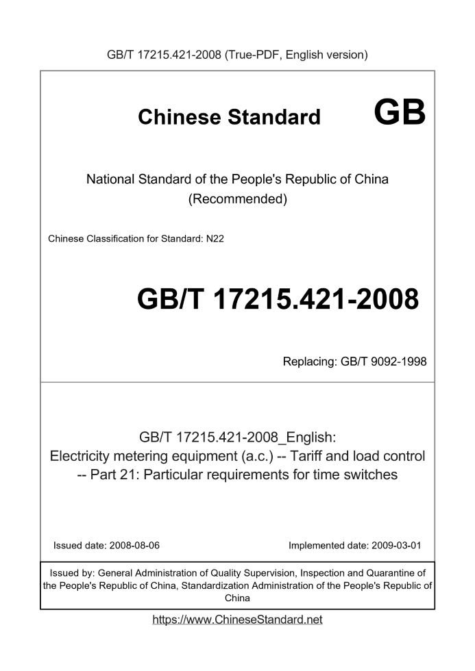Similar standardsGB/T 15284 GB/T 17215.321 GB/T 34067.2 GB/T 17215.241 GB/T 17215.302 GB/T 17215.686Basic dataStandard ID: GB/T 17215.421-2008 (GB/T17215.421-2008)Description (Translated English): Electricity metering equipment (a.c.) -- Tariff and load control -- Part 21: Particular requirements for time switches Sector / Industry: National Standard (Recommended) Classification of Chinese Standard: N22 Classification of International Standard: 17.220.20 Word Count Estimation: 11,121 Date of Issue: 2008-08-06 Date of Implementation: 2009-03-01 Older Standard (superseded by this standard): GB/T 9092-1998 Quoted Standard: IEC 62052-21-2004 Adopted Standard: IEC 62054-21-2004, IDT Regulation (derived from): Announcement of Newly Approved National Standards No. 12 of 2008 (No. 125 overall) Issuing agency(ies): General Administration of Quality Supervision, Inspection and Quarantine of the People's Republic of China, Standardization Administration of the People's Republic of China Summary: This standard specifies the latest manufacturing indoor use and has a working reserve time switch type test special requirements. Time switches commonly used in electricity load control, multi-rate Jidu energy metering equipment and the maximum demand devices. GB/T 17215.421-2008: Electricity metering equipment (a.c.) -- Tariff and load control -- Part 21: Particular requirements for time switches---This is a DRAFT version for illustration, not a final translation. Full copy of true-PDF in English version (including equations, symbols, images, flow-chart, tables, and figures etc.) will be manually/carefully translated upon your order. Electricity metering equipment (ac) Tariff and load control Part 21. Particular requirements for time switches ICS 17.220.20 N22 National Standards of People's Republic of China GB/T 17215.421-2008/IEC 62054-21.2004 Replacing GB/T 9092-1998 AC measurement tariff and load control Part 21. Particular requirements for time switches (IEC 62054-21.2004, IDT) Posted 2008-08-06 2009-03-01 implementation Administration of Quality Supervision, Inspection and Quarantine of People's Republic of China Standardization Administration of China released ForewordThis section is equivalent to using the IEC 62054-21 "AC measurements tariff and load control - Part 21. Particular requirements for time switches" 2004 edition. "This part of the preparation of the structure and format is consistent with IEC 62054-21. This Part replaces GB/T 9092-1998 "tariff and load control time switch." This part of GB/T 9092-1998 The main differences are as follows. --- Terminology and definitions, electrical requirements, mechanical requirements, weather conditions, electromagnetic field immunity test DC, AC electromagnetic field immunity Test, test conditions and type tests, radio interference suppression requirements of a direct reference to IEC 62052-21; --- This section increases the timing accuracy testing, electromagnetic field immunity test and fast transient tests done specifically described. Since the implementation of this section, the original national standard GB/T 9092-1998 repealed simultaneously. Appendix A of this section is an informative annex. This part is proposed by China Machinery Industry Federation. This part of the National Electrical Instrument Standardization Technical Committee (SAC/TC104) centralized. This section is drafted. Harbin Institute of Electrical Instrument. The main drafters of this section. Zhang Lihua, Han Guiju, Xu Renheng. This part of the standard replaces the previous editions are. --- GB/T 9092-1998. GB/T 17215.421-2008/IEC 62054-21.2004 AC measurement tariff and load control Part 21. Particular requirements for time switches1 ScopeGB/T 17215 in the provisions of this part of the latest special type tests made for indoor use and has a working time of the switch to reserve begging. Time switches commonly used in the electric power load control, maximum demand means multi-rate boarding and energy metering equipment. Switches maintain real time, it can save the date, but also be able to handle leap years, when it also supports daylight saving time, that is to say, according to the relevant rules, It can modify the local time and GMT offset. Time switch also has synchronization, switching time of the switch is also stored procedure table, which You can time period, week, or month in the specified date. Time switch according to the time table and stored procedures to control the output unit. This part of the internal structure of the time switch is not required. When the time switch function and multi-function meter function together, the relevant part of this section still apply. This section includes mechanical time having an analog dial or electronic digital display switch. --- Synchronous time switches; --- Crystal-controlled time switch. This section does not include receiver testing and conformance testing, but receives the test given as examples in Appendix A. Reliability requirements with reference to IEC 62059. This part of IEC 62052-21 when used simultaneously, this part of the terms better than IEC 62052-21.2 Normative referencesThe following documents contain provisions which, through reference GB/T 17215 in this section constitute provisions of this section. For dated reference documents Member, all subsequent amendments (not including errata content) or revisions do not apply to this section, however, encouraged to reach under this section Parties to research agreement to use the latest versions of these documents. For undated reference documents, the latest versions apply to this section. IEC 62052-21.2004 AC electronic power meter General requirements, tests and test conditions - Part 21. tariff and load control Claim3 Terms and DefinitionsIEC 62052-21 The definitions apply to this section. Standard electrical values \u200b\u200b4 Value given in IEC 62052-21 apply to this section.5 Mechanical requirements and testsRequirements given in IEC 62052-21 and tes