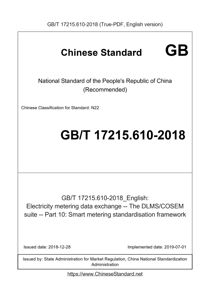 Delivery: <= 4 days. True-PDF full-copy in English will be manually translated and delivered via email. GB/T 17215.610-2018: Electricity metering data exchange -- The DLMS/COSEM suite -- Part 10: Smart metering standardisation framework Status: Valid
