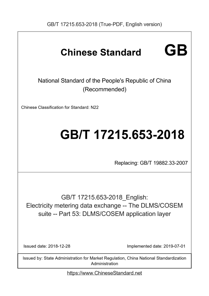 Delivery: <= 16 days. True-PDF full-copy in English will be manually translated and delivered via email. GB/T 17215.653-2018: Electricity metering data exchange -- The DLMS/COSEM suite -- Part 53: DLMS/COSEM application layer Status: Valid