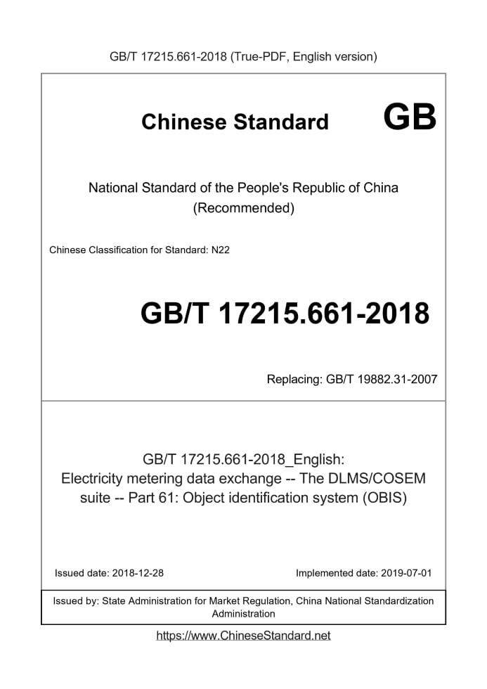 Delivery: <= 5 days. True-PDF full-copy in English will be manually translated and delivered via email. GB/T 17215.661-2018: Electricity metering data exchange -- The DLMS/COSEM suite -- Part 61: Object identification system (OBIS) Status: Valid