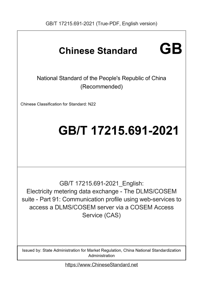 Delivery: <= 8 days. True-PDF full-copy in English will be manually translated and delivered via email. GB/T 17215.691-2021: Electricity metering data exchange - The DLMS/COSEM suite - Part 91: Communication profile using web-services to access a DLMS/COSEM server via a COSEM Access Service (CAS) Status: Valid