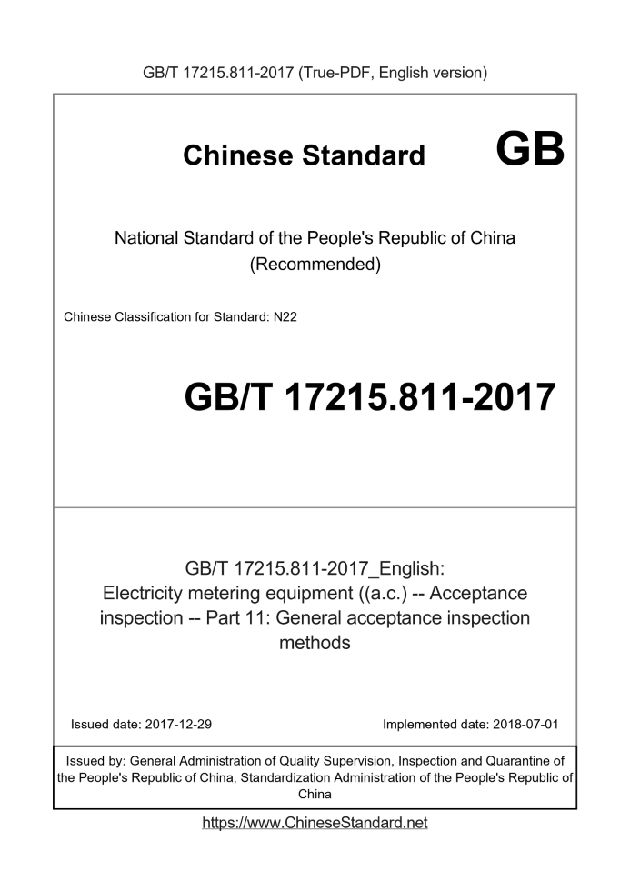 Delivery: <= 5 days. True-PDF full-copy in English will be manually translated and delivered via email. GB/T 17215.811-2017: Electricity metering equipment ((a.c.) -- Acceptance inspection -- Part 11: General acceptance inspection methods Status: Valid