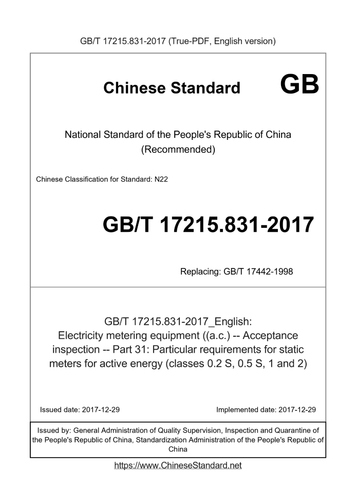 Delivery: <= 3 days. True-PDF full-copy in English will be manually translated and delivered via email. GB/T 17215.831-2017: Electricity metering equipment ((a.c.) -- Acceptance inspection -- Part 31: Particular requirements for static meters for active energy (classes 0.2 S, 0.5 S, 1 and 2) Status: Valid