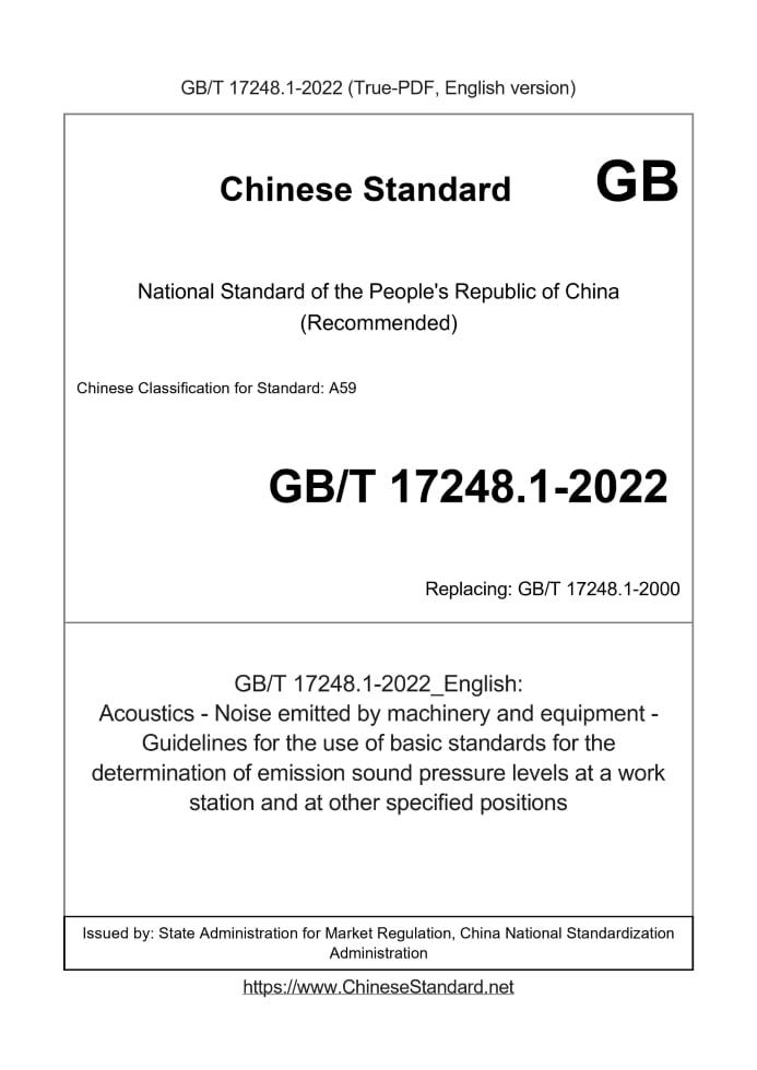 Delivery: <= 6 days. True-PDF full-copy in English will be manually translated and delivered via email. GB/T 17248.1-2022: Acoustics - Noise emitted by machinery and equipment - Guidelines for the use of basic standards for the determination of emission sound pressure levels at a work station and at other specified positions Status: Valid GB/T 17248.1: Historical versions