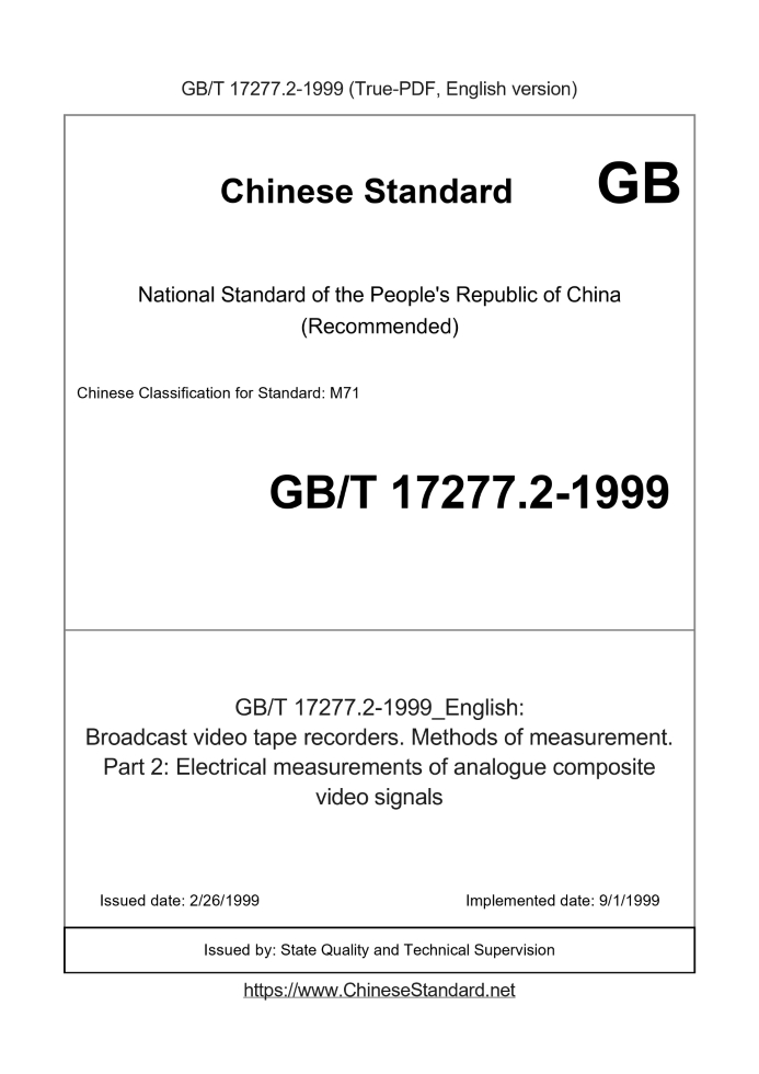 Basic dataStandard ID: GB/T 17277.2-1999 (GB/T17277.2-1999)Description (Translated English): Broadcast video tape recorders. Methods of measurement. Part 2: Electrical measurements of analogue composite video signals Sector / Industry: National Standard (Recommended) Classification of Chinese Standard: M71 Classification of International Standard: 33.160.40 Word Count Estimation: 30,310 Date of Issue: 2/26/1999 Date of Implementation: 9/1/1999 Adopted Standard: IEC 61237-2-1995, MOD Issuing agency(ies): State Quality and Technical Supervision Summary: This standard specifies the recording, reproducing the analog broadcast video tape recorders measurement methods and test signals composite video signal. Video Characteristics Measurement This standard applies to 625-line PAL-D system radio tape recorder analog composite channel. Tips & Frequently Asked Questions:Question 1: How long will the true-PDF of GB/T 17277.2-1999_English be delivered?Answer: Upon your order, we will start to translate GB/T 17277.2-1999_English as soon as possible, and keep you informed of the progress. The lead time is typically 3 ~ 5 working days. The lengthier the document the longer the lead time.Question 2: Can I share the purchased PDF of GB/T 17277.2-1999_English with my colleagues?Answer: Yes. The purchased PDF of GB/T 17277.2-1999_English will be deemed to be sold to your employer/organization who actually pays for it, including your colleagues and your employer's intranet.Question 3: Does the price include tax/VAT?Answer: Yes. Our tax invoice, downloaded/delivered in 9 seconds, includes all tax/VAT and complies with 100+ countries' tax regulations (tax exempted in 100+ countries) -- See Avoidance of Double Taxation Agreements (DTAs): List of DTAs signed between Singapore and 100+ countriesQuestion 4: Do you accept my currency other than USD?Answer: Yes. If you need your currency to be printed on the invoice, please write an email to Sales@ChineseStandard.net. In 2 working-hours, we will create a special link for you to pay in any currencies. Otherwise, follow the normal steps: Add to Cart -- Checkout -- Select your currency to pay. |