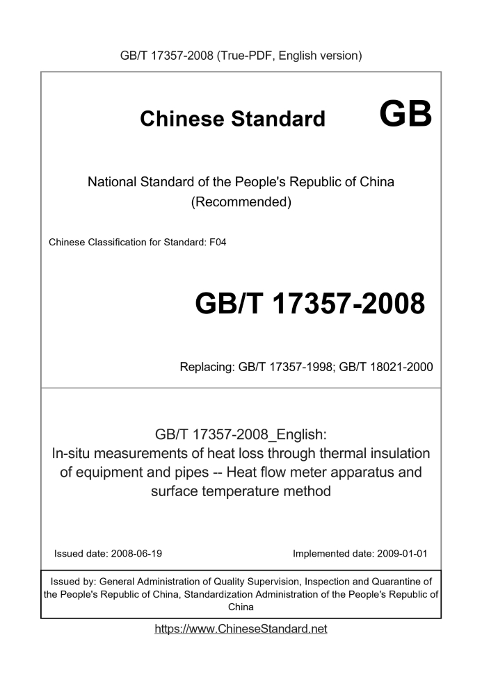 Delivery: <= 3 days. True-PDF full-copy in English will be manually translated and delivered via email. GB/T 17357-2008: In-situ measurements of heat loss through thermal insulation of equipment and pipes -- Heat flow meter apparatus and surface temperature method Status: Valid GB/T 17357: Historical versions