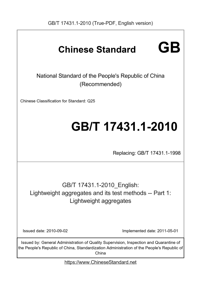 Delivery: <= 3 days. True-PDF full-copy in English will be manually translated and delivered via email. GB/T 17431.1-2010: Lightweight aggregates and its test methods -- Part 1: Lightweight aggregates Status: Valid GB/T 17431.1: Historical versions