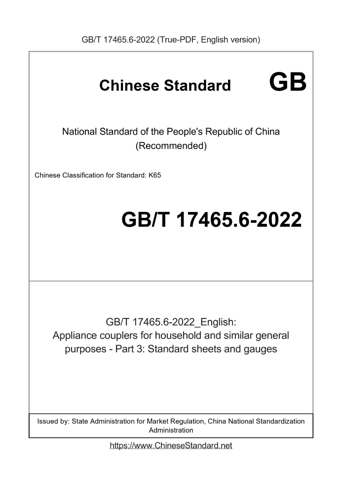 Delivery: <= 10 days. True-PDF full-copy in English will be manually translated and delivered via email. GB/T 17465.6-2022: Appliance couplers for household and similar general purposes - Part 3: Standard sheets and gauges Status: Valid