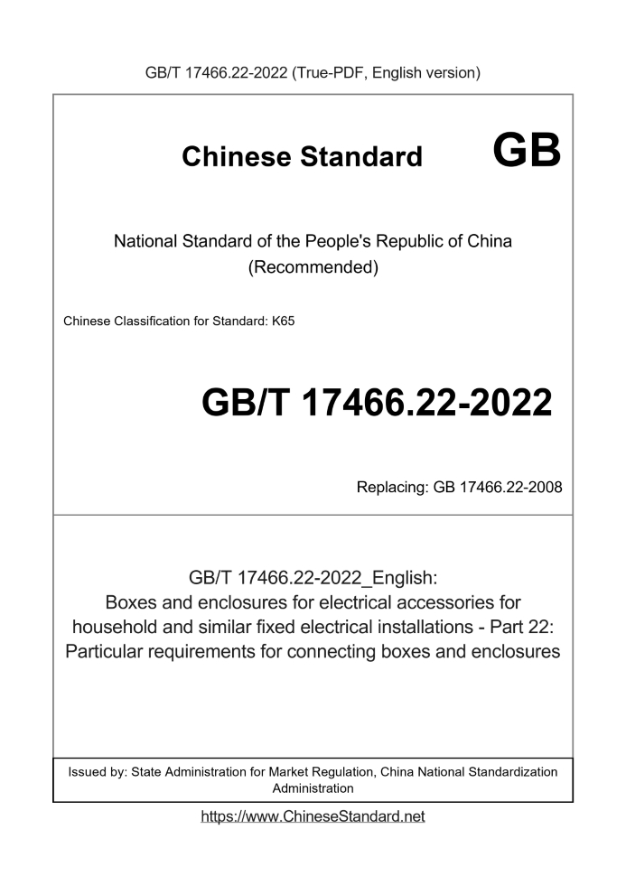 Delivery: <= 4 days. True-PDF full-copy in English will be manually translated and delivered via email. GB/T 17466.22-2022: Boxes and enclosures for electrical accessories for household and similar fixed electrical installations - Part 22: Particular requirements for connecting boxes and enclosures Status: Valid GB/T 17466.22: Historical versions