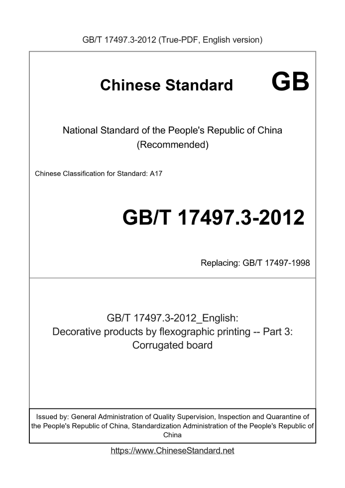 Delivery: <= 3 days. True-PDF full-copy in English will be manually translated and delivered via email. GB/T 17497.3-2012: Decorative products by flexographic printing -- Part 3: Corrugated board Status: Valid