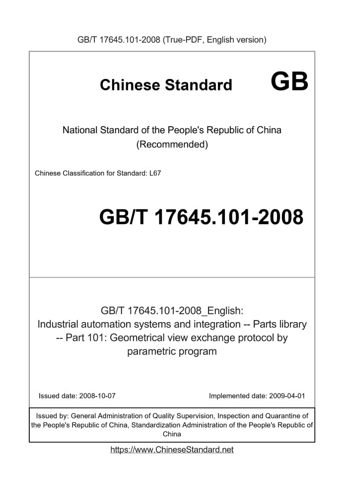 Delivery: <= 4 days. True-PDF full-copy in English will be manually translated and delivered via email. GB/T 17645.101-2008: Industrial automation systems and integration -- Parts library -- Part 101: Geometrical view exchange protocol by parametric program Status: Valid