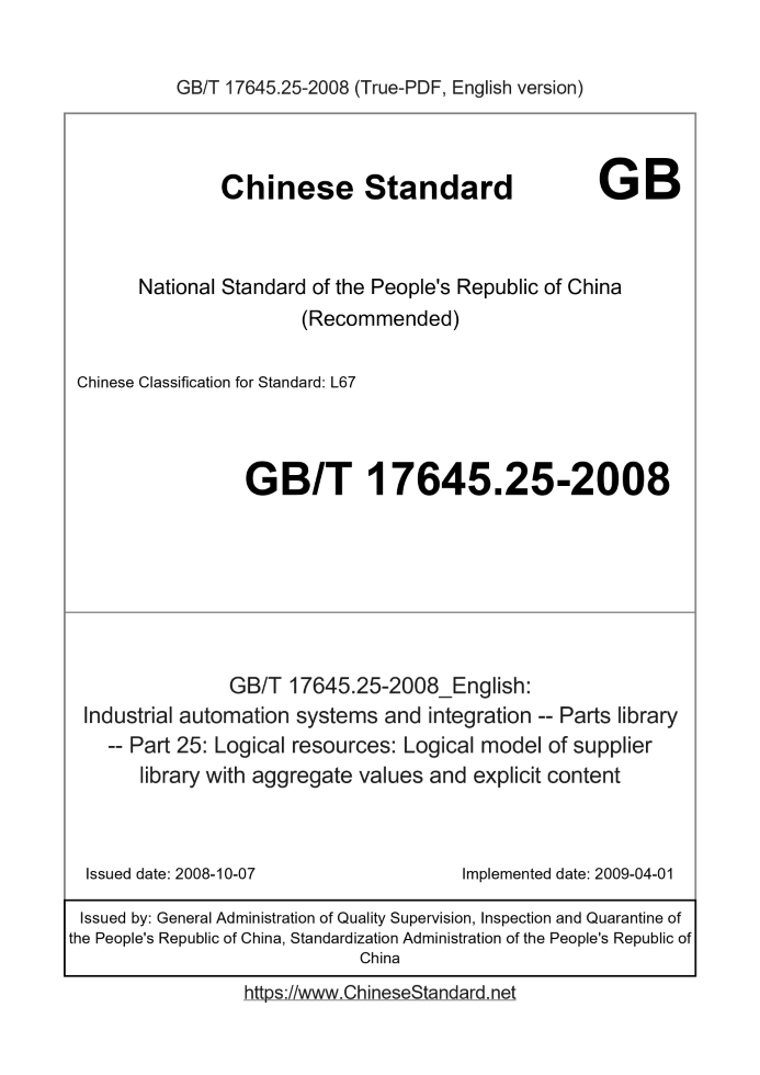 Delivery: <= 8 days. True-PDF full-copy in English will be manually translated and delivered via email. GB/T 17645.25-2008: Industrial automation systems and integration -- Parts library -- Part 25: Logical resources: Logical model of supplier library with aggregate values and explicit content Status: Valid