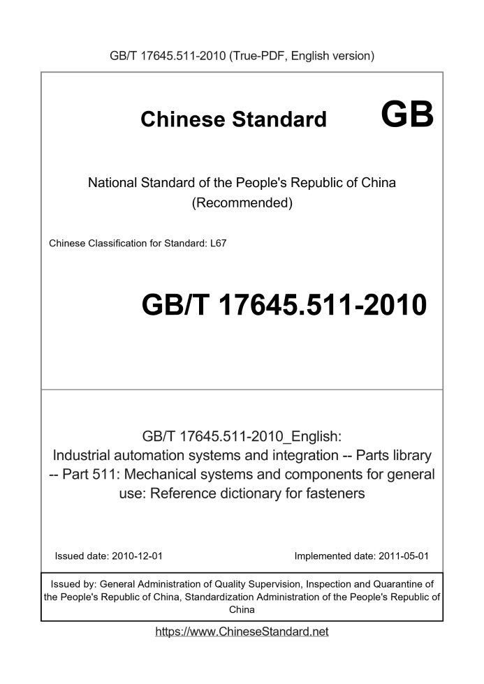 Basic dataStandard ID: GB/T 17645.511-2010 (GB/T17645.511-2010)Description (Translated English): Industrial automation systems and integration -- Parts library -- Part 511: Mechanical systems and components for general use: Reference dictionary for fasteners Sector / Industry: National Standard (Recommended) Classification of Chinese Standard: L67 Classification of International Standard: 25.040.40 Word Count Estimation: 175,172 Date of Issue: 2010-12-01 Date of Implementation: 2011-05-01 Quoted Standard: GB/T 3099-1982, GB/T 16262.1-2006, GB/T 16656.1-2008, GB/T 16656.11-2010, GB/T 16656.21-2008, GB/T 17564.4-2009, GB/T 17645.1-2008, GB/T 17645.24-2003, GB/T 17645.25-2008, GB/T 17645.42-2001 Adopted Standard: ISO 13584-511-2006, MOD Regulation (derived from): Announcement of Newly Approved National Standards No. 9, 2010 (No. 164 overall) Issuing agency(ies): General Administration of Quality Supervision, Inspection and Quarantine of the People's Republic of China, Standardization Administration of the People's Republic of China Summary: This standard specifies the mechanical fasteners national standard reference dictionary provides all the components, including its classification features and range. This section applies to: all kinds of standard fasteners expression data, expression of various characteristics of fasteners standard data, expression range of standard fasteners characteristic data. This section does not apply to: for the provisions of this section defines standard data structure part family methodology, exchange for standard data defined in this part of the implementation. GB/T 17645.511-2010: Industrial automation systems and integration -- Parts library -- Part 511: Mechanical systems and components for general use: Reference dictionary for fasteners---This is a DRAFT version for illustration, not a final translation. Full copy of true-PDF in English version (including equations, symbols, images, flow-chart, tables, and figures etc.) will be manually/carefully translated upon your order. Industrial automation systems and integration Parts library Part 511. Mechanical systems and components for general use. Reference dictionary for fasteners ICS 25.040.40 L67 National Standards of People's Republic of China Industrial automation systems and integration Parts library Part 511. Mechanical systems and components for general. Fasteners reference dictionary Partslibrary-Part 511. Mechanicalsystemsand componentsforgeneraluse. Referencedictionaryforfasteners (ISO 13584-511.2006, MOD) Issued on. 2010-12-01 2011-05-01 implementation Administration of Quality Supervision, Inspection and Quarantine of People's Republic of China Standardization Administration of China released Table of ContentsPreface Ⅰ Introduction Ⅱ 1 Scope 1 2 Normative references 1 3 Terms, definitions and abbreviations 2 4 expression and ontology concept dictionary entry 5 5 classification principles 11 5.1 Relationship with existing classification 11 5.2 hierarchical structure of the upper 11 5.3 lower hierarchy 11 11 5.4 Coding format 5.5 General characteristics and classification of properties 12 6 computer interpretable Description 12 6.1 external file 12 6.2 Information Model and consistency class 13 Appendix A (normative) information object registration 16 Appendix B (normative) Classification Table 17 Annex C (normative) definition of fasteners 30 Annex D (normative) definition of fastener characteristics DET 97 Appendix E (normative) classification mechanism 156ForewordGB/T 17645 "Industrial automation systems and integration Parts library" is a multi-part standard, each part published separately. Each part of GB/T 17645 belongs, according to the functions are divided into a plurality of sub-series. Concept description logic resources to achieve resource description methods consistency Test, view exchange protocol concerning standardization dictionary content, including. --- The first part defines the concept of 10 to 19 is described; Part --- 20 to 29 provides logical resources; --- 30 to 39 section provides resource; Part --- 40 to 49 defines the method described; Part --- 50 to 59 specifies conformance testing; --- Part 100 to 199 specifies the view exchange protocol; --- The first 500 to 599 provided specific dictionary of standardized content. GB/T 17645 "Industrial automation systems and integration Parts Library" has now published the following nine sections. --- Part 1, Overview and fundamental principles; --- Part 20, Logical resources. Logical model of expressions; --- Part 24, Logical resources. Logical model of supplier library; --- Part 25, logical resource. with aggregate value and supplier base logical model explicit content; --- Part 26, logical resource. Information supplier identification; --- Part 31, of resources. Geometric programming interface; --- Part 42, description. - part family construction methodology; --- Part 101, the view exchange protocol. the geometric parameters of the program view exchange protocol; --- Part 102, view exchange protocol. meet GB/T 16656 regulations consistent view exchange protocol. This section is GB/T Part 51,117,645, gives standardized in line with GB/T 17645 series of standards fasteners dictionary content. The partial modification of international standard ISO 13584-511.2006 "Industrial automation systems and integration - Parts library - Part 511. Machine Mechanical systems and common parts. Fastener reference dictionary. " This part of ISO 13584-511 in the technical content. consistent with 2006, but considering the country International Standard describes the contents of the dictionary is limited to fasteners fasteners international standard content, can not meet the needs of the domestic use, therefore I Content fastener country national standards included in this standard. Object registration information in Appendix A. This section of the Appendix A, Appendix B, Appendix C, Appendix D and Appendix E are normative appendix. This section pre
