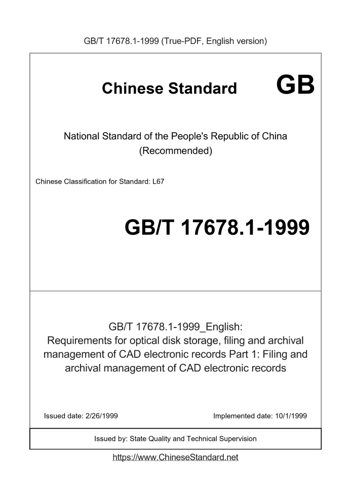 Delivery: <= 5 days. True-PDF full-copy in English will be manually translated and delivered via email. GB/T 17678.1-1999: Requirements for optical disk storage, filing and archival management of CAD electronic records Part 1: Filing and archival management of CAD electronic records