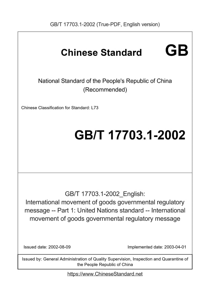 Delivery: <= 3 days. True-PDF full-copy in English will be manually translated and delivered via email. GB/T 17703.1-2002: International movement of goods governmental regulatory message -- Part 1: United Nations standard -- International movement of goods governmental regulatory message Status: Valid