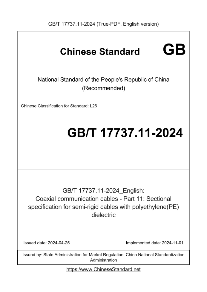 Delivery: <= 4 days. True-PDF full-copy in English will be manually translated and delivered via email. GB/T 17737.11-2024: Coaxial communication cables - Part 11: Sectional specification for semi-rigid cables with polyethylene(PE) dielectric Status: Valid