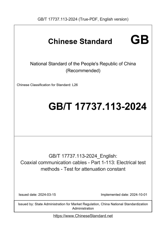 Delivery: <= 3 days. True-PDF full-copy in English will be manually translated and delivered via email. GB/T 17737.113-2024: Coaxial communication cables - Part 1-113: Electrical test methods - Test for attenuation constant Status: Valid