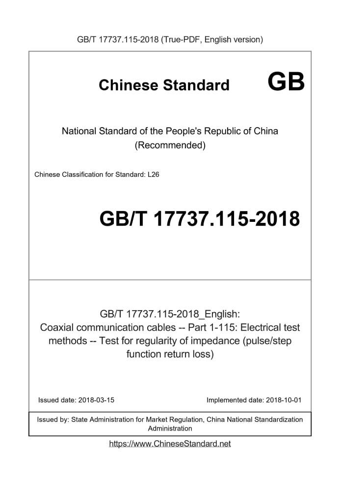 Delivery: <= 2 days. True-PDF full-copy in English will be manually translated and delivered via email. GB/T 17737.115-2018: Coaxial communication cables -- Part 1-115: Electrical test methods -- Test for regularity of impedance (pulse/step function return loss) Status: Valid