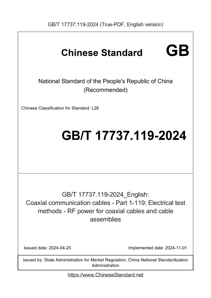 Delivery: <= 5 days. True-PDF full-copy in English will be manually translated and delivered via email. GB/T 17737.119-2024: Coaxial communication cables - Part 1-119: Electrical test methods - RF power for coaxial cables and cable assemblies Status: Valid