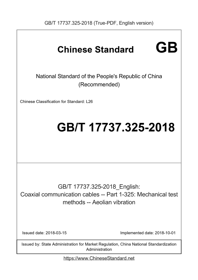 Delivery: <= 2 days. True-PDF full-copy in English will be manually translated and delivered via email. GB/T 17737.325-2018: Coaxial communication cables -- Part 1-325: Mechanical test methods -- Aeolian vibration Status: Valid
