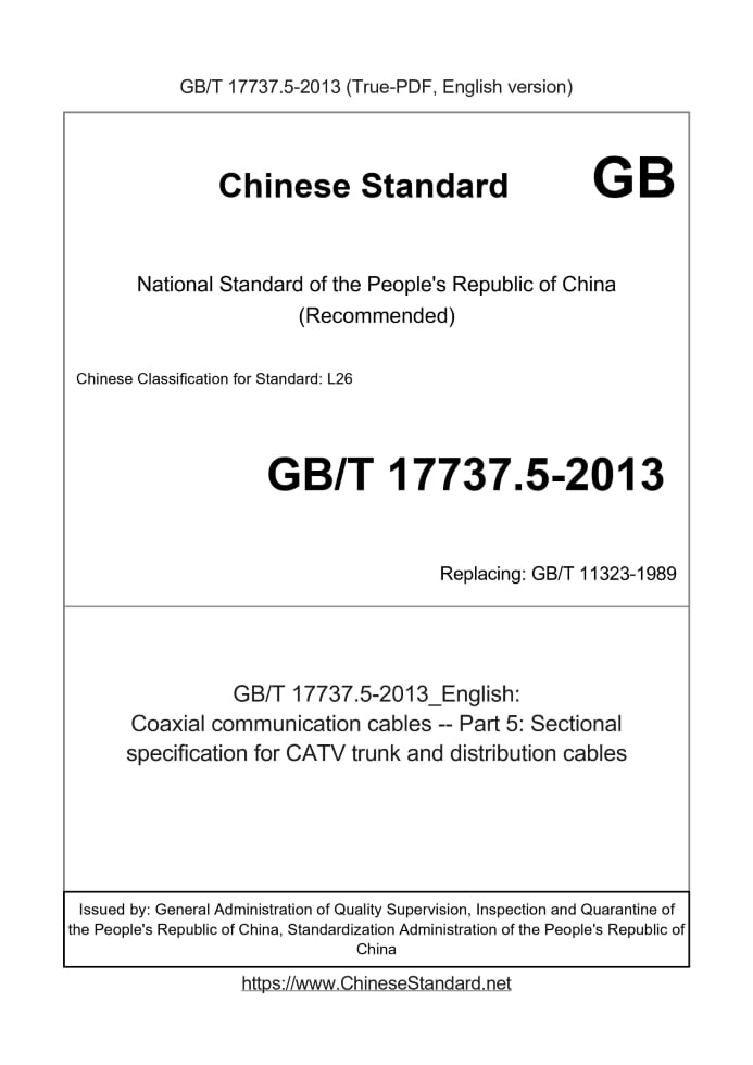 Delivery: <= 3 days. True-PDF full-copy in English will be manually translated and delivered via email. GB/T 17737.5-2013: Coaxial communication cables -- Part 5: Sectional specification for CATV trunk and distribution cables Status: Valid